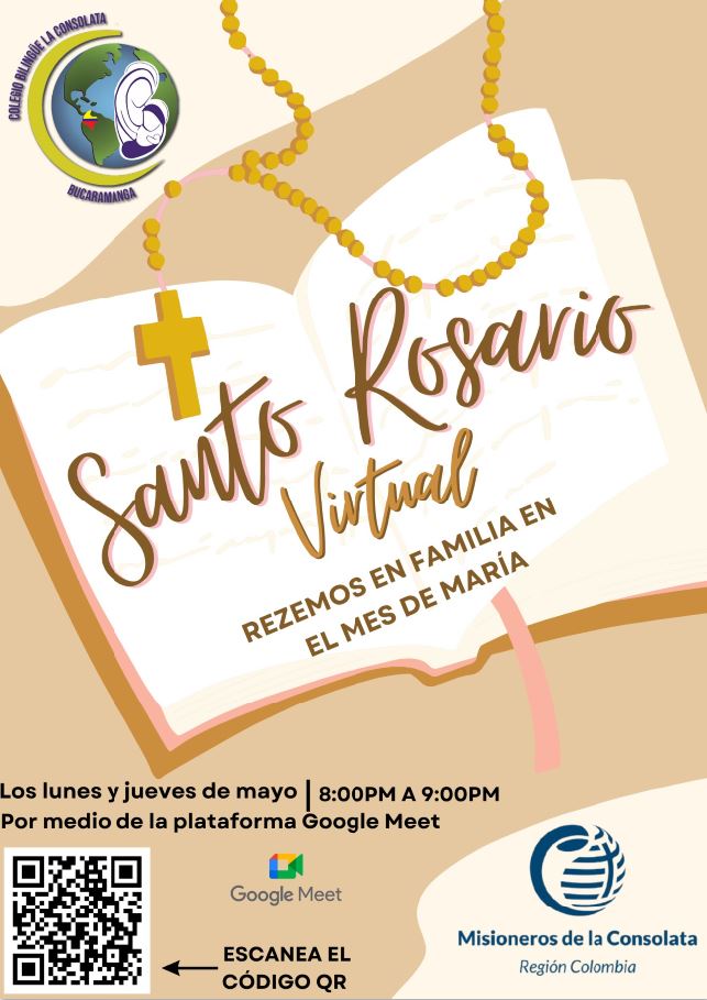 El Colegio Bilingüe la Consolata invita a todas las familias a unirse al rezo del santo rosario,Todos los lunes y jueves del mes de mayo de 8:00pm a 9:00pm vía Meet
